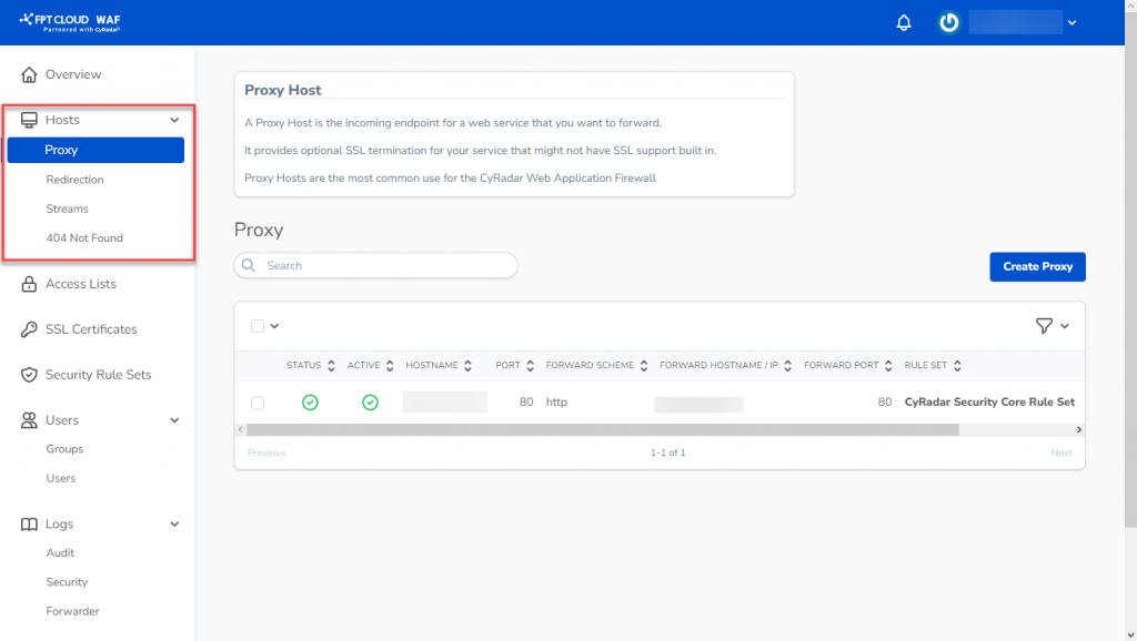 Bước 1:WAF Dashboard , chọn Hosts > Proxy. Userguide FPT WAF 2022 17 Bước 2:Proxy cần cập nhật thông tin chọn icon Edit. Userguide FPT WAF 2022 19 Bước 3: Nhập các thông tin cần cập nhật. Userguide FPT WAF 2022 20 Bước 4: Chọn Update Proxy để lưu các thông tin và trở về trang Proxy Management. Userguide FPT WAF 2022 21
