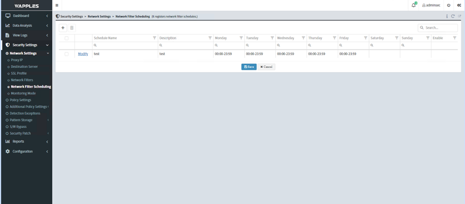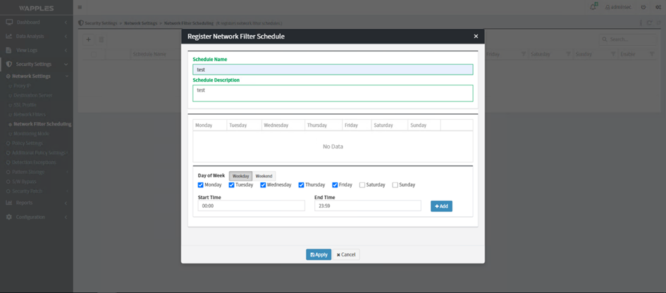 fpt-cloud-wapplesSử dụng thiết lập thời gian thực hiện các security group trong network filterNetwork Filters Scheduling Sử dụng thiết lập thời gian thực hiện các security group trong network filter Các trường cần điền Schedule name Schedule description Day of Week : Lựa chọn thời gian thực hiện. Có thể chọn từng ngày hoặc chọn nhanh các ngày trong tuần hoặc cuối tuần Start Time và End Time : Thời gian bắt đầu và kết thúc muốn Security Group hoạt động trong ngày Các trường hiển thị