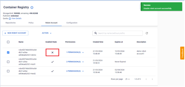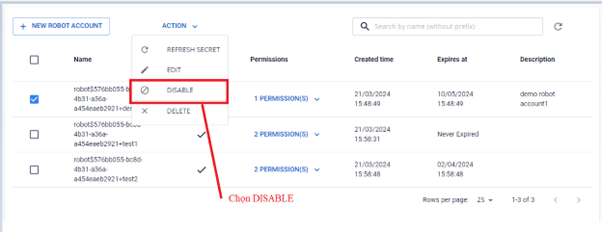Bước 1 : Tương tự như thực hiện Edit Robot Account, tích chọn Robot Account muốn disable, sau đó chọn ACTION DISABLE :