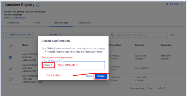 Bước 2 : Trên Portal xuất hiện hộp thoại để xác nhận hành động. Nhập DISABLE để thực hiện disable account: