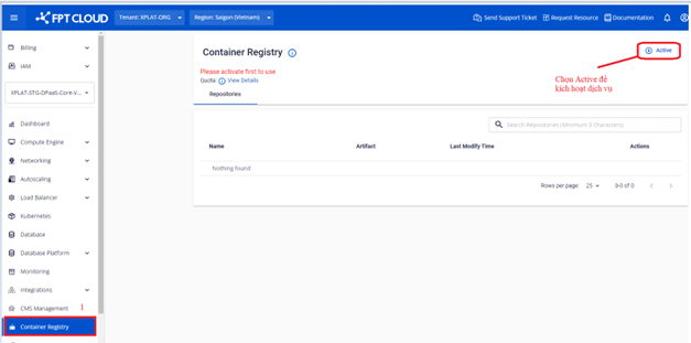 Bước 1 : Tại màn hình Container Registry > Active để kích hoạt dịch vụ FPT Container Registry.
