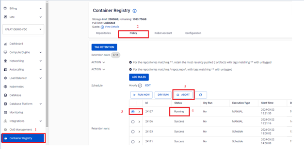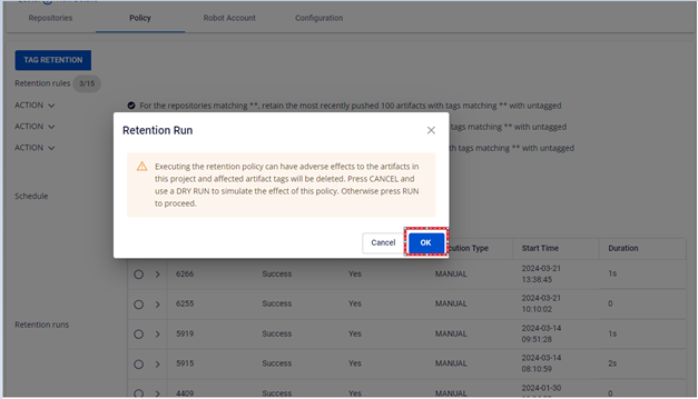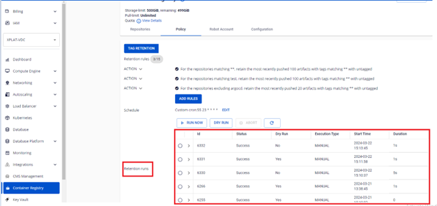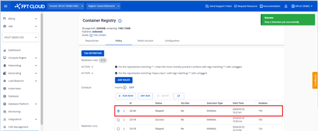 Người dùng có thể quản lý danh sách các Retention Run đã chạy quy tắc. Ngoài ra người dùng có thể chạy thủ công các quy tắc, chạy DRY RUN để kiểm tra cấu hình quy tắc, ABORT một retentions đang chạy, xem chi tiết mỗi lần chạy quy tắc và logs đã chạy. 1. Chạy các quy tắc thử công với RUN NOW Để thực hiện chạy quy tắc, người dùng có thể thực hiện như sau: Bước 1 : Tại menu FPT Portal > Container Registry > Policy > RUN NOW Bước 2 : Click OK để confirm chạy Retentions: Bước 3 : Kết quả sau khi chạy Retention 2. Chạy Retention với DRY RUN Bước 1 : Tại menu FPT Portal > Container Registry > Policy > DRY RUN Bước 2 : Kết quả sau khi chạy DRY RUN Khác với chạy RUN NOW, DRY RUN sẽ không thực sự xoá các images trên repository 3. Abort một Retention Run Người dùng có thể Abot một Retention đang Running thực hiện như sau: Bước 1 : Tại menu FPT Portal > Container Registry > Policy > click retentions đang Running > ABORT Bước 2 : Click OK để confirm hành động Abort Bước 3 : Kết quả sau khi thực hiện Abort 4. Xem danh sách các retention run Bước 1 : Tại menu FPT Portal > Container Registry > Policy 5. Xem logs một retention run Bước 1 : Tại menu FPT Portal > Container Registry > Policy > Click vào một Retention run để xem chi tiết một task run Bước 2 : Kiểm tra logs chạy retentions run cho một repository: