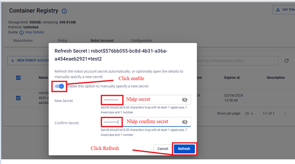User/Token chỉ hiển thị khi người dùng tạo Robot Account lần đầu, FPT CLOULD hỗ trợ người dùng tạo mới lại secret trong trường hợp người dùng bị mất/quên token đang sử dụng. Bước 1 : Tương tự như thực hiện Edit Robot Account, tích chọn Robot Account muốn tạo lại secret, sau đó chọn ACTION REFRESH SECRET Bước 2 : Có 2 cách để thực hiện Refresh secret : Cách 1: Tự động refresh robot account: Hệ thống sẽ tự động tạo mới một secret tương tự luồng tạo, người dùng cần export to file hoặc copy và lưu lại secret. Cách 2: Người dùng chủ động cấu hình secret như sau: Sau khi cấu hình xong secret người dùng cần lưu lại secret đã cấu hình để sử dụng.