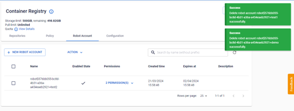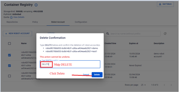 Bước 1 : Tương tự như thực hiện Edit Robot Account, tích chọn Robot Account muốn xoá, sau đó chọn ACTION DELETE. Người dùng có thể thực hiện xoá nhiều robot account cùng một lúc, trong trường hợp này, người dùng tích chọn nhiều robot account cùng lúc, action hiển thị chỉ có duy nhất actions xoá Bước 2 : Trên Portal xuất hiện hộp thoại để xác nhận hành động. Nhập DELETE để thực hiện xoá account: Bước 3 : Kết quả sau khi thực hiện delete Robot Account: