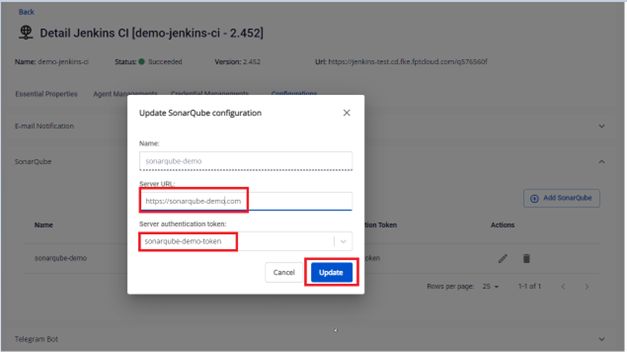 Bước 1. Tại menu FPT Portal > Jenkins CI > Detail Cluster > Configurations > SonarQube > Chọn SonarQube server cần chỉnh sửa: Bước 2. Nhập thông tin các thông tin muốn sửa FPT Cloud cho phép chỉnh sửa thông tin server url hoặc chọn lại credential authen tới hệ thống sonarqube. Bước 3. Kết quả sau khi chỉnh sửa