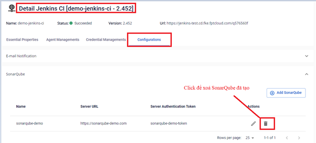 Bước 1. Tại menu FPT Portal > Jenkins CI > Detail Cluster > Configurations > SonarQube > Chọn SonarQube server muốn xóa: Bước 2. Nhập confirm text để xác thực hành động Bước 3. Kết quả sau khi xoá SonarQube config Kết quả dưới hệ thống Jenkins: