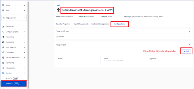 FPT Cloud hỗ trợ người dùng cấu hình Telegram Bot trong hệ thống Jenkins phục vụ việc gửi thông báo tới người dùng thông qua giao diện Portal. Để thực hiện cấu hình, người dùng thực hiện như sau: