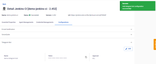 Bước 1. Tại menu FPT Portal > Jenkins CI > Detail Cluster > Configurations > Telegram Bot > Chọn Edit: Alt text Bước 2. Thực hiện cấu hình Telegram Bot: Alt text Alt text Bước 3. Kết quả sau khi cấu hình Alt text Kiểm tra kết quả dưới Jenkins: Alt text