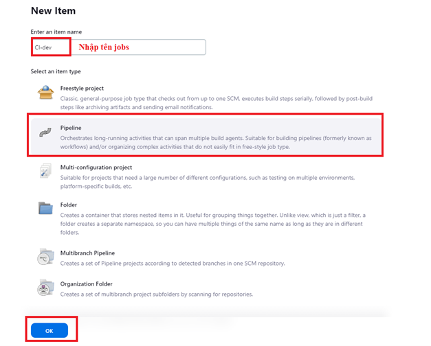 - Tạo job với loại Pipeline để thiết lập một luồng CI/CD cơ bản: Click New Item hoặc Create a job để tạo một pipeline jobs CI/CD: