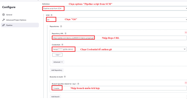 Cấu hình pipeline jobs với pipeline script. Có 2 lựa chọn để cấu hình jenkinsfile: Cách 1: Nhập script pipeline qua giao diện Jenkins: