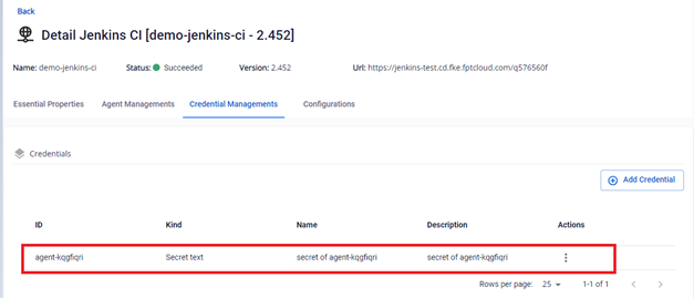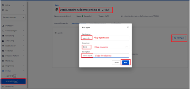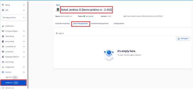 Bước 1. Tại menu FPT Portal > Jenkins CI > Detail Cluster > Agent Managements :