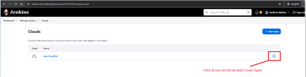 Đăng nhập vào hệ thống Jenkins > Manage Jenkins > Cloud :