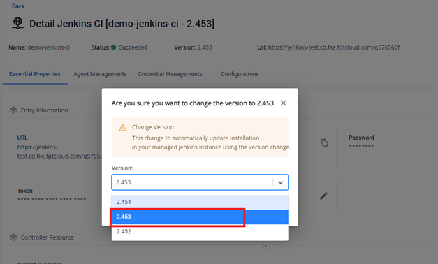 FPT Cloud hỗ trợ người dùng upgrade phiên bản Jenkins lên phiên bản mới hơn trong số các phiên bản FPT Cloud support. Hiện tại trên Portal đang support một số phiên bản bao gồm: 2.452,2.453,2.454. Bước 1. Vào menu Essential Properties > Instance Information Bước 2. Thực hiện chọn version muốn upgrade: Bước 3. Nhấn update để thực hiện Upgrade version. Bước 4. Kết quả sau khi upgrade version thành công Lưu ý: Hệ thống sẽ mất một khoảng thời gian để upgrade version.
