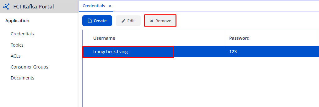 In order to delete a credential, follow the steps: Step 1 : Select the credential to delete > Click Remove. Step 2 : In the confirmation dialog, select Yes to confirm deletion.