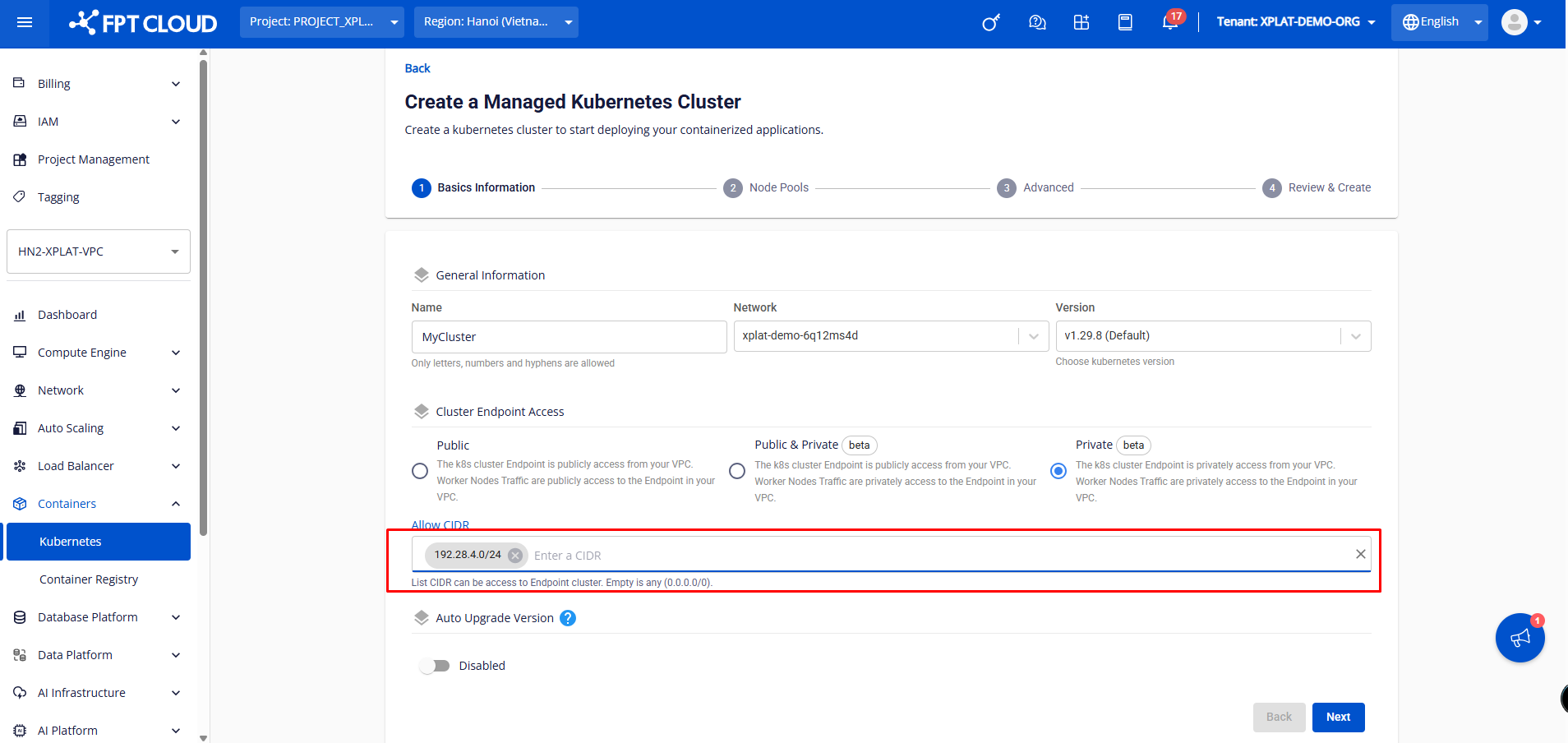 • Nếu chọn Public & Private hoặc Private, sẽ xuất hiện thêm trường Allow CIDR để nhập danh sách các dải địa chỉ IP có quyền truy cập vào Endpoint của Kubernetes Cluster.