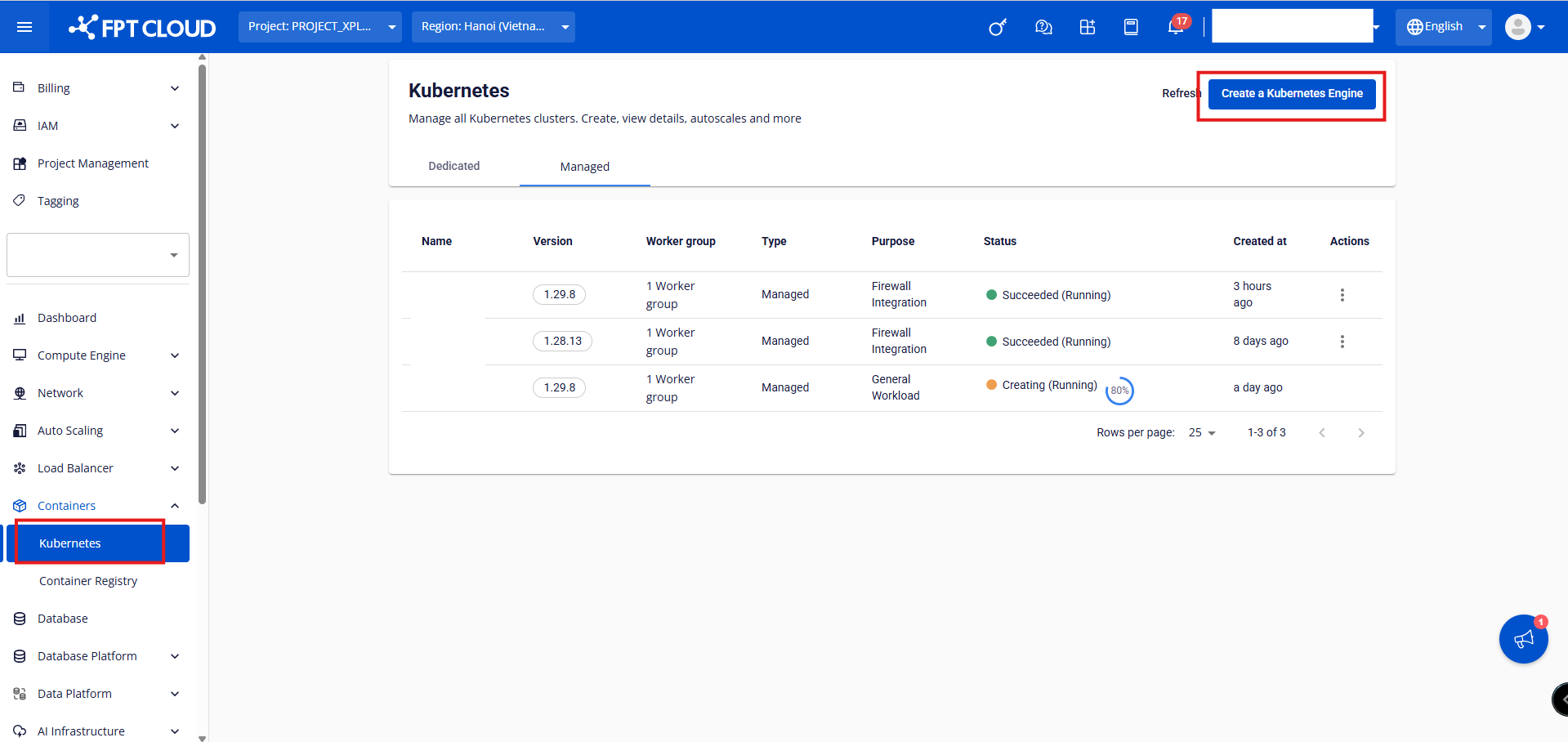 Bước 4 : Ấn Create và kiểm tra lại các thông tin khởi tạo. Bước 5 : Theo dõi trạng thái khởi tạo cụm Kubernetes. Sau khi trạng thái Successed (Running) thì tiến hành sử dụng, triển khai ứng dụng. 2️⃣ GPU H100 SXM5 Bước 1: Trên menu của FPT Portal chọn Containers >Kubernetes > Create a Kubernetes Engine. Bước 2: Nhập thông tin cơ bản của cụm cluster sau đó click button 1.1. Basics Information: