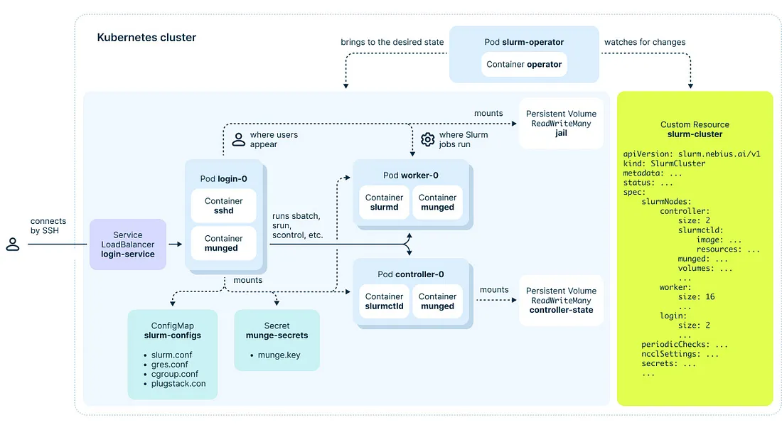 volumeSourceName: "jail" | Cấu hình worker nodes, với 2 login nodes, expose sshd service bằng load-balancer service type trong k8s, sử dụng publickey định nghĩa tại sshRootPublicKeys cho root user và mount các volume tương tự controller node & worker node. |