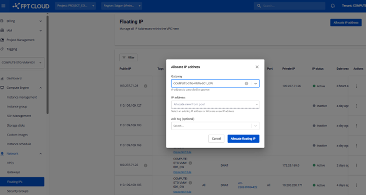 Ở màn hình Floating IP, hệ thống cho phép người dùng chọn Gateway khi Allocate IP, hover vào tooltip ở thông tin của Gateway để biết được Gateway loại Basic hay Custom