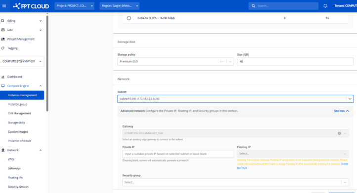 Khi tạo Instance, hệ thống auto fill thông tin Gateway dựa trên Subnet đã chọn trước đó (Gateway được gán vào Subnet). Nếu Gateway loại Custom, người dùng sẽ không được chọn Floating IP (hệ thống sẽ disable field này)