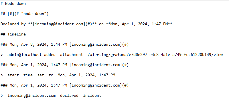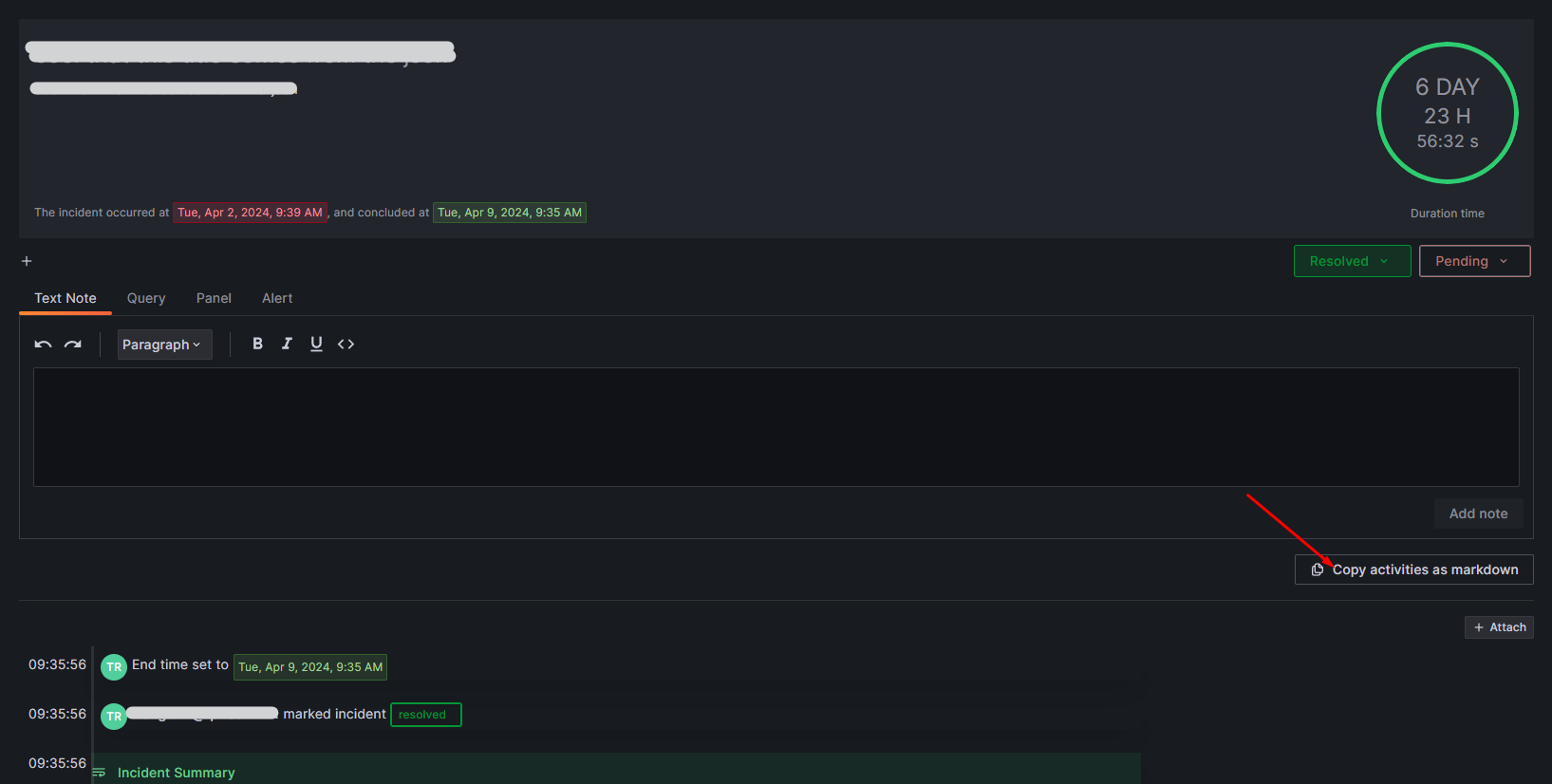 Tính năng này cho phép người dùng trích xuất các activity log của incident dưới dạng markdown. Các bước thực hiện như sau: Bước 1: Vào chi tiết 1 incident Bước 2: Click vào nút “Copy activities as markdown ”. Các activity log này sẽ được export dưới dạng markdown. Alt text Ví dụ như sau: Alt text