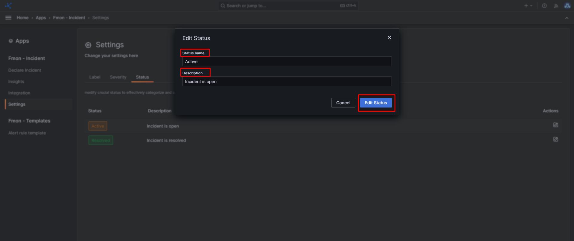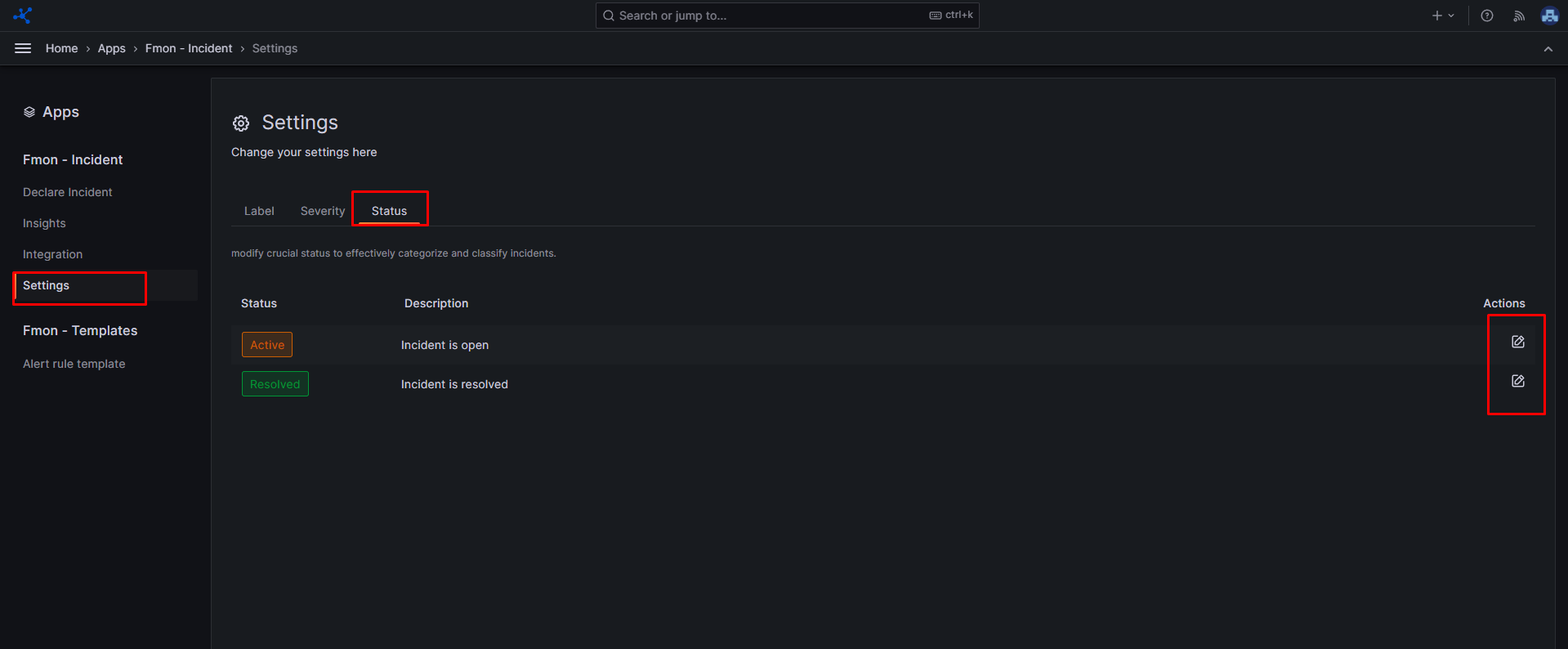 Bước 3 : Ở tab Status , chọn một serverity có sẵn, click pencil icon