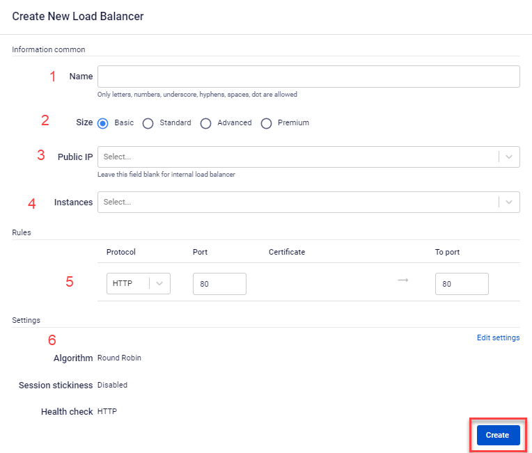 | Rules | Xác định cách lưu lượng truy cập được định tuyến từ Load Balancer đến các máy ảo. Hiện tại hệ thống chỉ hỗ trợ tạo 1 rule cho mỗi Load Balancer. |