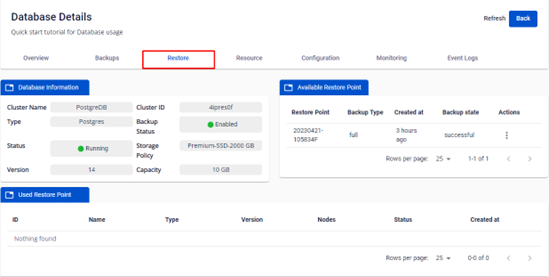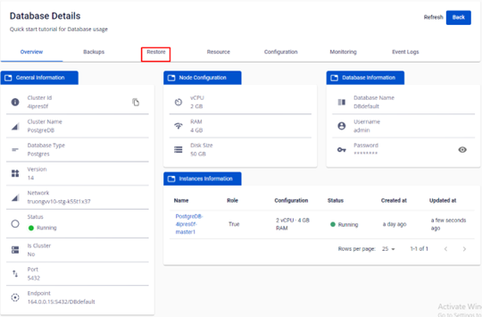 1 Tạo Restore Point Để có thể sử dụng được tính năng restore, quý khách cần có • Một Database Engine đã được tạo (provision) thành công • Ít nhất một job backup đã được tạo và chạy qua 1 mốc thời gian schedule Bước 1: Chọn Database Engine > Chọn một ID Cluster > trên *Database Detail , chọn tab Restore • Sau khi có một bản Backup được chạy, tại tab Available Restore point hiển thị Restore Point có một bản Backup Type. o Job Full sẽ tạo ra 1 restore point với backup type Full o Job Diff sẽ tạo ra 1 restore point với backup type Diff • Tại cột Actions bấm vào dấu 3 chấm > chọn Restore • Màn hình xuất hiện popup Restore Database , quý khách có thể lựa chọn cấu hình lại cho Restored Database bằng cấu hình có sẵn Preset Configuration hoặc cấu hình Custom Configuation do khách hàng tự nhập theo quota cho sẵn. • Sau đó nhấn Restore • Sau khi một Restore tạo thành công, trên Database Management sẽ xuất hiện Id Cluster mới có tên Restore + tên ID Cluster mới from Id Cluster cũ.