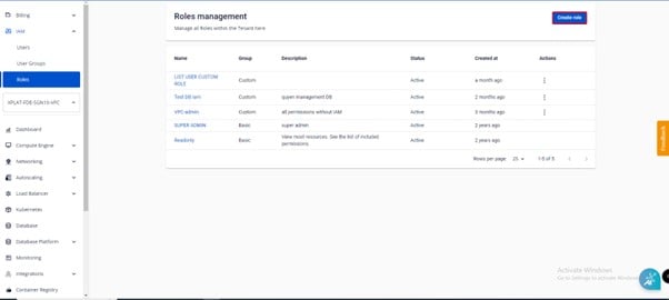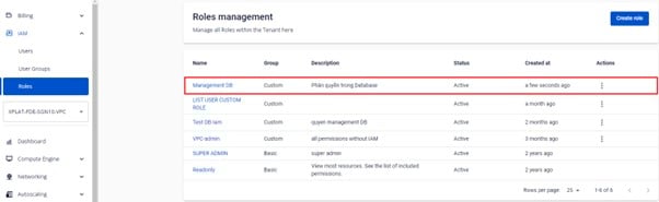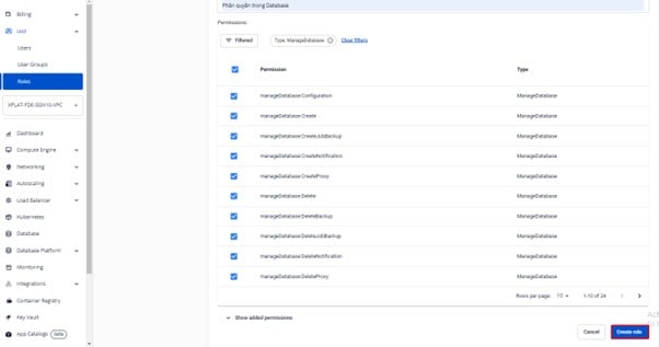 Bước 4 : Người dùng tích chọn hoặc không tích chọn các permission thuộc ManageDatabase cần phân quyền > bấm Create role.