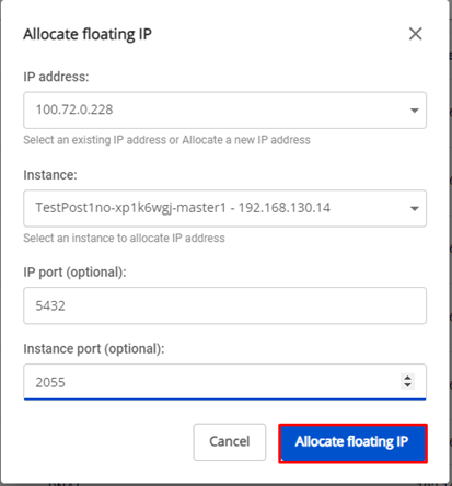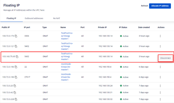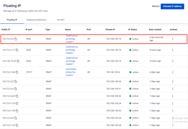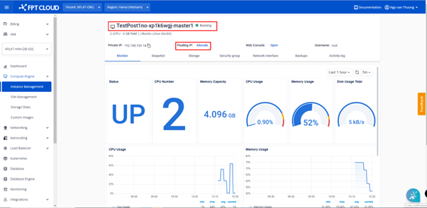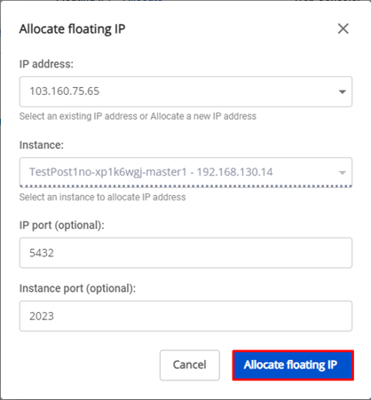 Floating IP được dùng để lưu giữ IP Public và điều hướng truy cập từ internet vào máy ảo. Để máy ảo có thể truy cập được từ ngoài internet, bạn cần gắn một Floating IP cho nó. Nếu không còn nhu cầu hoặc muốn thay đổi endpoint, bạn có thể chuyển hướng Floating IP sang máy ảo khác cùng VPC với 1 vài thao tác đơn giản. Trường hợp 1: Tạo Floating IP từ cụm Database: Bước 1: Menu > Database Platform > Relational Database/ Non-Relational Database/ Search Engines/ Data Streaming/ Time Series Db > chọn một ID Cluster có trạng thái Running. Bước 2: Xuất hiện màn hình Database Detail > tại tab Overview chọn Instances List > Click vào Name có role True. Bước 3: Xuất hiện màn hình link từ Node Database đến Instance Management > Tại Floating IP chọn Allocate. Bước 4: Pop up Allocate Floating Ip , người dùng nhập thông tin cần thiết: