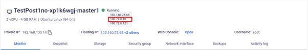 Bước 5: Sau khi tạo xong Allocate floating IP, sẽ hiển thị thông tin địa chỉ Floating IP : Bước 6: Kiểm tra thông tin địa chỉ IP vừa tạo Allocate: Menu > Networking > Floating IPs > kiểm tra thông tin Ip public có trạng thái Active.