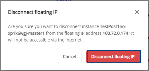 Xuất hiện popup Disconnect floating IP: người dùng xác nhận lại thông tin một lần nữa và bấm Disconnect floating IP. Trường hợp 2: Tạo Floating IP từ Network không qua cụm Database Dùng để tạo mới Floating khi người dùng disconnect IP pubic đã tạo hoặc từ cụm Database khi bấm instance không hiển thị Allocate ở Floating IP. Bước 1: Menu > Networking > Floating Ips > bấm Allocate IP address Bước 2: Pop up Allocate Floating Ip, người dùng nhập thông tin cần thiết: