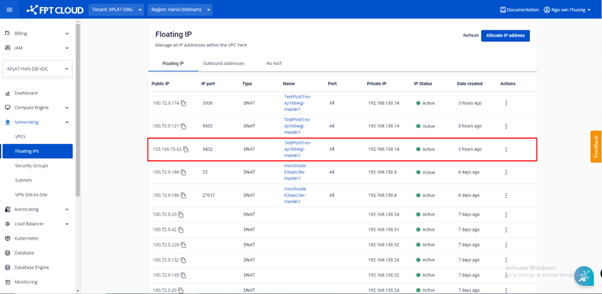 Bước 3: Kiểm tra thông tin địa chỉ IP vừa tạo Allocate: Menu > Networking > Floating IPs > kiểm tra thông tin Ip public có trạng thái Active. Bước 4: Sau khi tạo xong Allocate floating IP, sẽ hiển thị thông tin địa chỉ Floating IP tại cụm Database: Sau khi có địa chỉ Floating IP người dùng lấy địa chỉ IP này để kết nối Database.