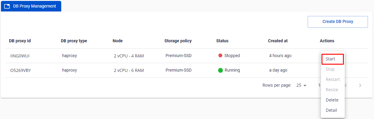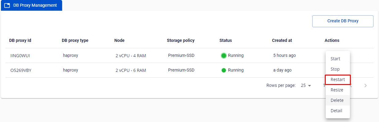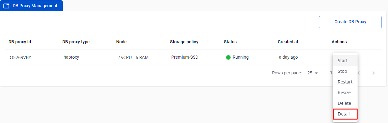 • Chọn Actions ở DB Proxy cluster ID quý khách muốn stop