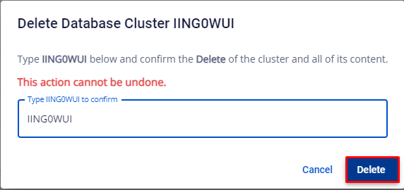 • Xuất hiện popup Delete Database Cluster ID , quý khách nhập lại Cluster ID để xác nhận lại, bấm Delete