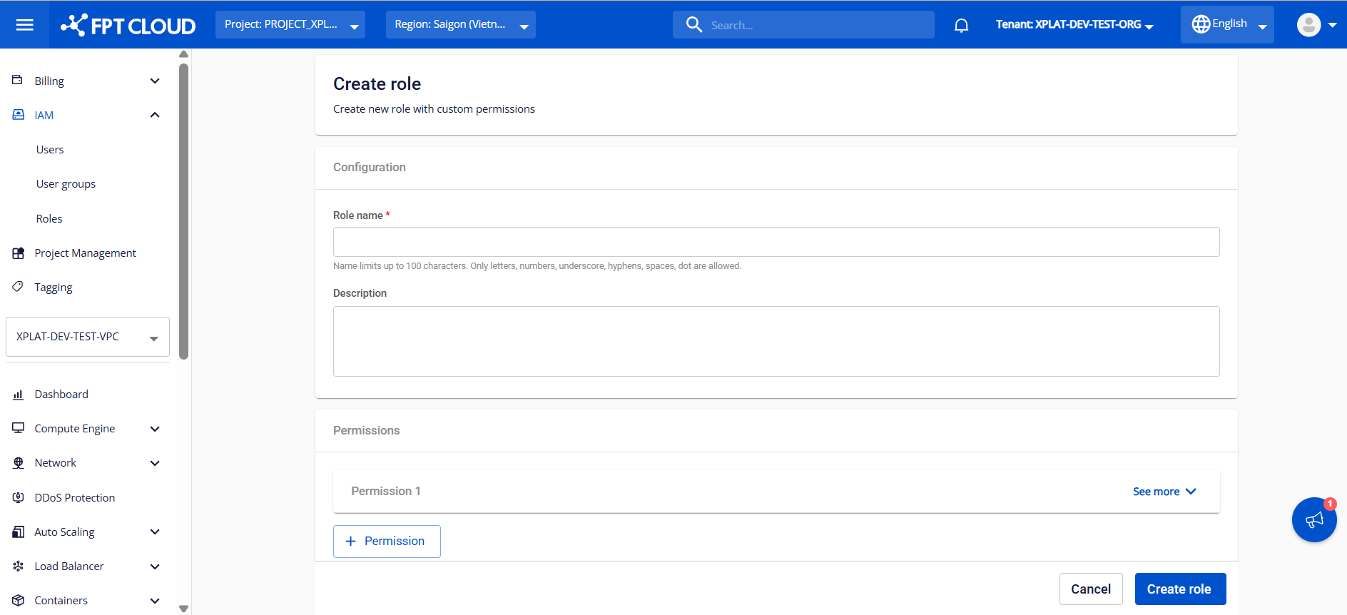 Role là một thành phần cốt lõi của mô-đun IAM trên FPT Cloud Portal. Chức năng Quản lý Role cho phép quản trị hệ thống định nghĩa và gán các vai trò với tập quyền truy cập (permissions) cụ thể cho người dùng khi sử dụng dịch vụ FPT Database Engine. Việc sử dụng role giúp tăng cường bảo mật thông qua kiểm soát truy cập chi tiết, áp dụng nguyên tắc phân quyền tối thiểu, đồng thời hỗ trợ tách biệt quyền hạn theo từng nhu cầu và mô hình vận hành. Các bước dưới đây cung cấp hướng dẫn chi tiết để tạo mới một Role và gán các quyền truy cập (permissions) tương ứng cho role đó.