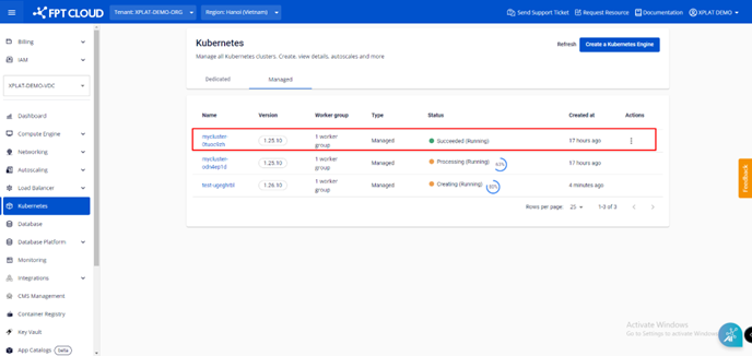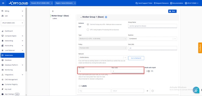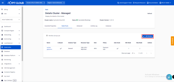 Bước 1 : Ở menu chọn Kubernetes , hệ thống sẽ hiển thị trang Kubernetes Management. Chọn Cluster muốn tùy chỉnh cấu hình Cluster Autoscale. Bước 2 : Chọn Nodes Pool > Edit workers. Bước 3 : Điều chỉnh số lượng worker theo nhu cầu sử dụng. Bước 4 : Kiểm tra lại thông tin, chọn Save.
