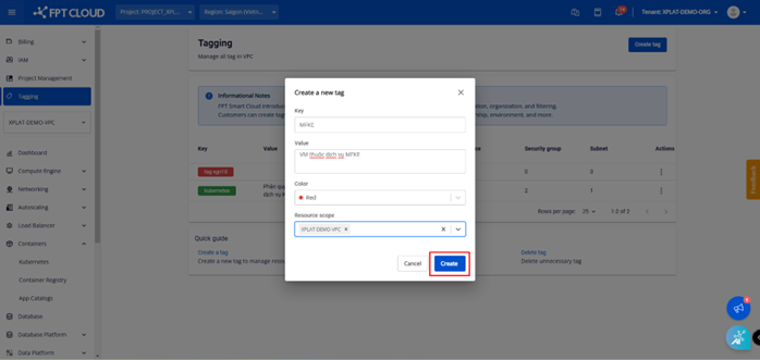 Để có thể đánh tag cho VM nằm trong worker group MFKE, người dùng cần phải tạo trước tag theo đúng mục đích sử dụng.