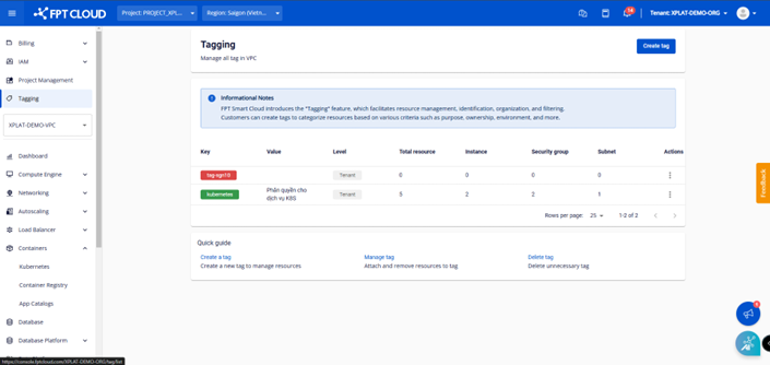 Tính năng Tagging cho phép người dùng gắn nhãn các máy ảo bằng những thẻ tùy chỉnh (tags) nhằm mục đích phân loại, tìm kiếm và quản lý tài nguyên hiệu quả hơn.