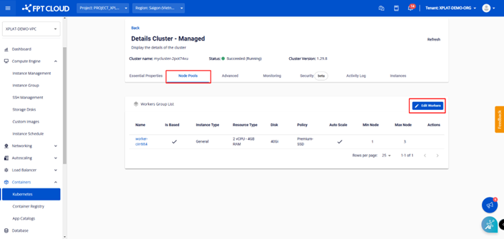 Bước 2 : Chọn Node Pools > Edit Workers