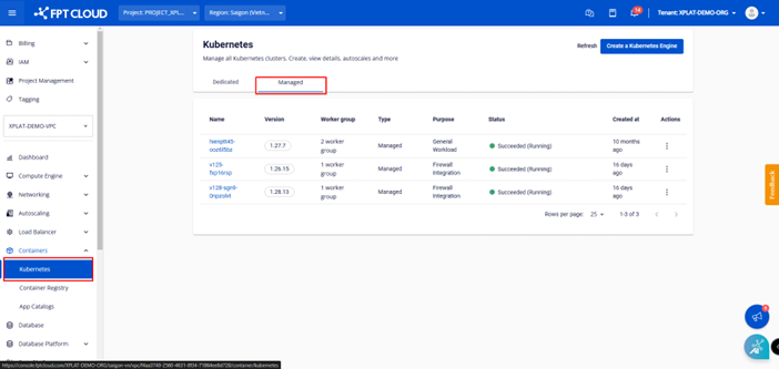 Bước 1 : Trên Unify Portal , chọn Kubernetes → Chọn Managed → Chọn Create a Kubernetes Engine để tạo cluster mới.