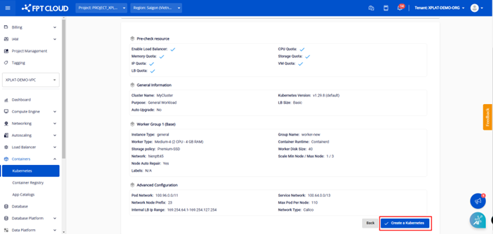 Nhập đầy đủ các thông tin cần thiết cho cụm cluster và nhấn button Create a Kubernetes.