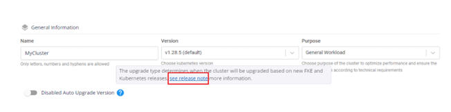 Để xem thông tin chi tiết về các mốc thời gian quan trọng của một Kubernetes version được hỗ trợ bởi FPT cloud, click vào biểu tượng “?”.