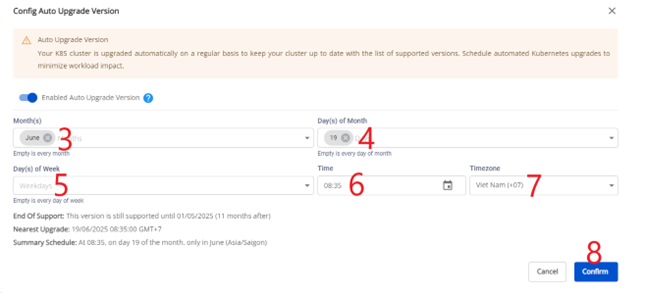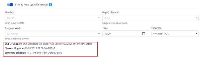 Nếu enable tính năng Auto Upgrade Version mà không cấu hình thời gian upgrade, mặc định thời điểm upgrade sẽ là 07:00 GMT+7 vào ngày đầu tiên khi version đó end of standard support