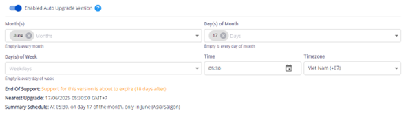 Sau khi cấu hình thời gian sẽ thực hiện auto upgrade, có thể xem thời điểm version hiện tại sẽ end of support, thời điểm gần nhất sẽ thực hiện auto upgrade và tổng hợp về lập lịch auto upgrade.