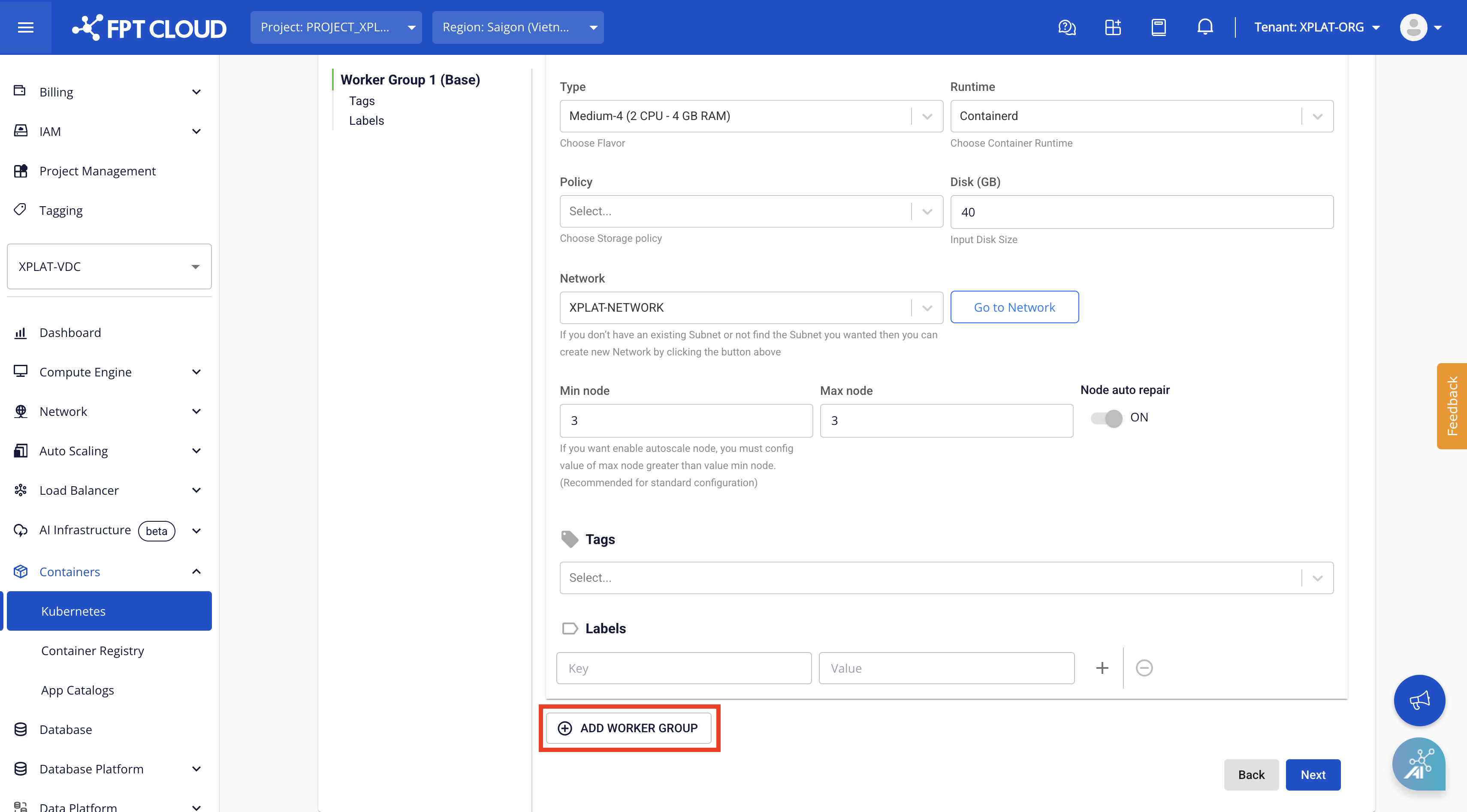 - Người dùng có thể thêm các worker group khi khởi tạo k8s cluster bằng cách click button ADD WORKER GROUP.
