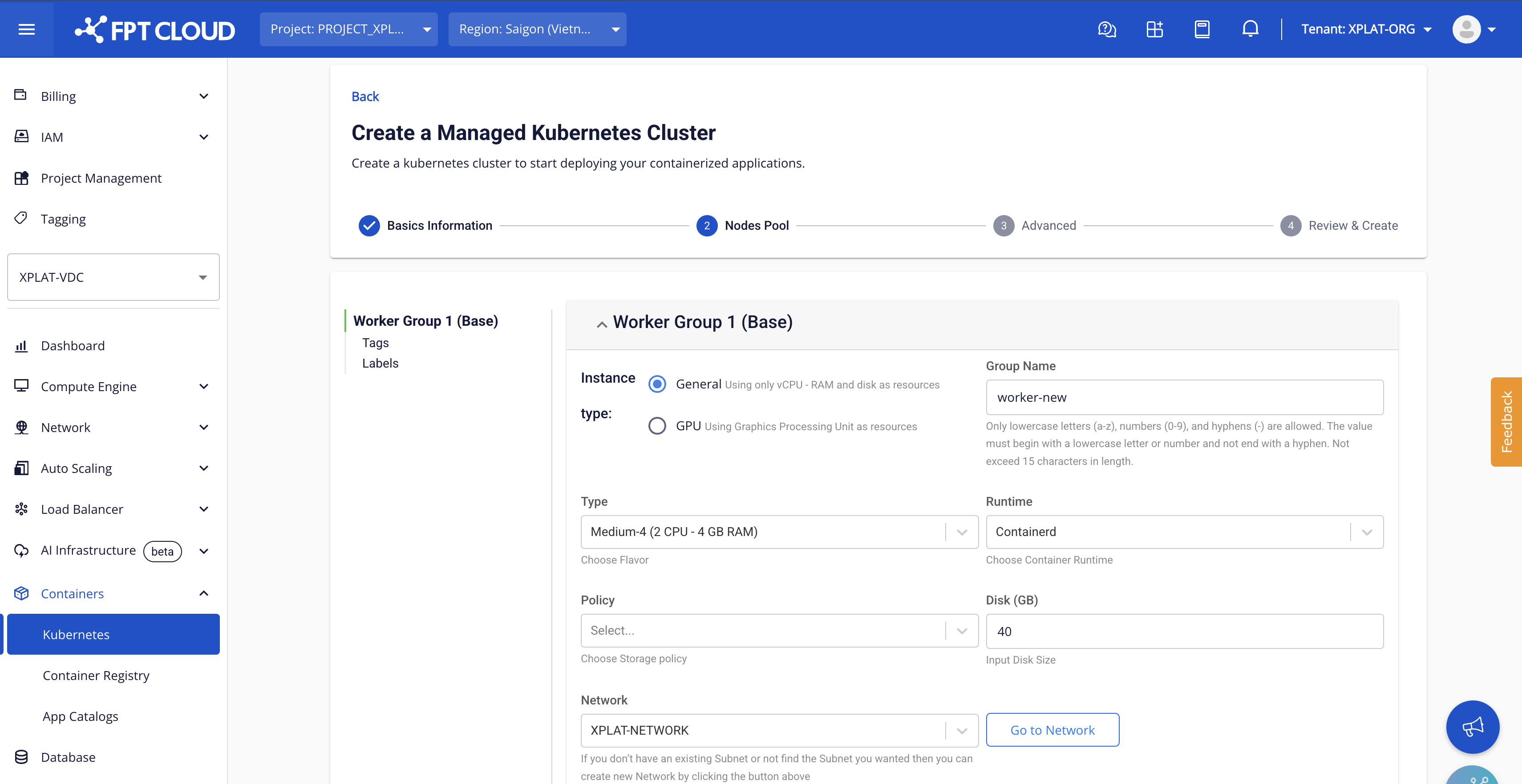 - Disk (GB): Chọn dung lượng root disk cho các Worker Node.