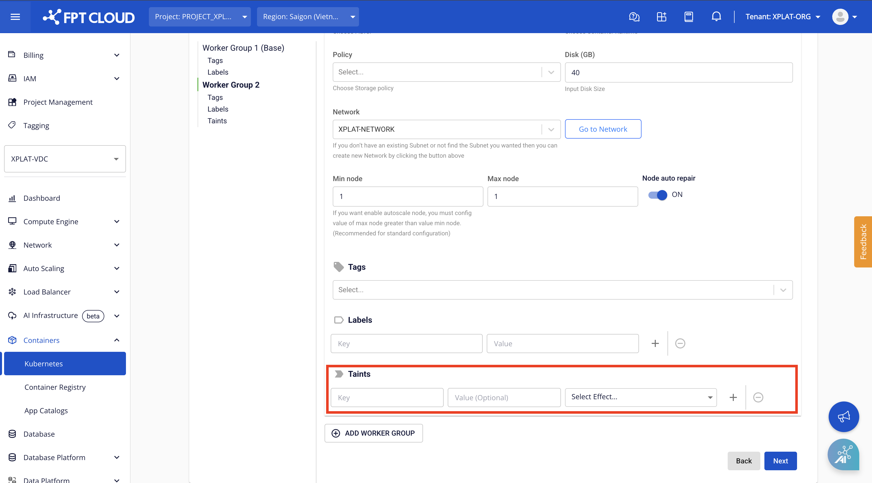 Ngoài ra, từ Worker Group 2 trở đi người dùng có thể cấu hình taint cho các worker group nhằm mục đích schedule ứng dụng trên các worker nodes. Các taint cũng có thể thêm, xóa, chỉnh sửa dễ dàng.