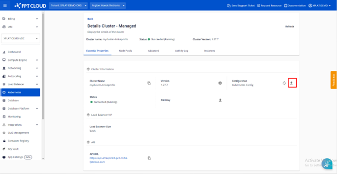 Bước 1 : Ở menu chọn Kubernetes , hệ thống sẽ hiển thị trang Kubernetes Management. Chọn Cluster muốn lấy thông tin truy cập Cluster. Bước 2: Ở mục Essential Properties > Cluster Information > Configuration, có thể download file kubeconfig để đăng nhập Cluster thông qua kubectl hoặc các công cụ khác. Gợi ý: M-FKE sử dụng native Kubernetes, người dùng sử dụng cluster với các công cụ kubectl và dashboard như với Kubernetes Cluster thông thường.