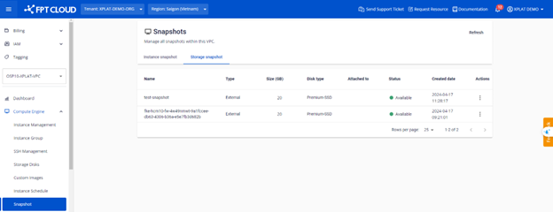 Sau khi tạo xong snapshot trong kubernetes, người dùng kiểm tra lại snapshot trên tab snapshot ở mục Compute Engine trên Unify Portal : và kiểm tra trong kubernetes bằng câu lệnh: