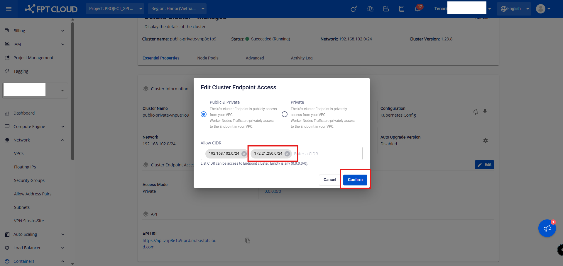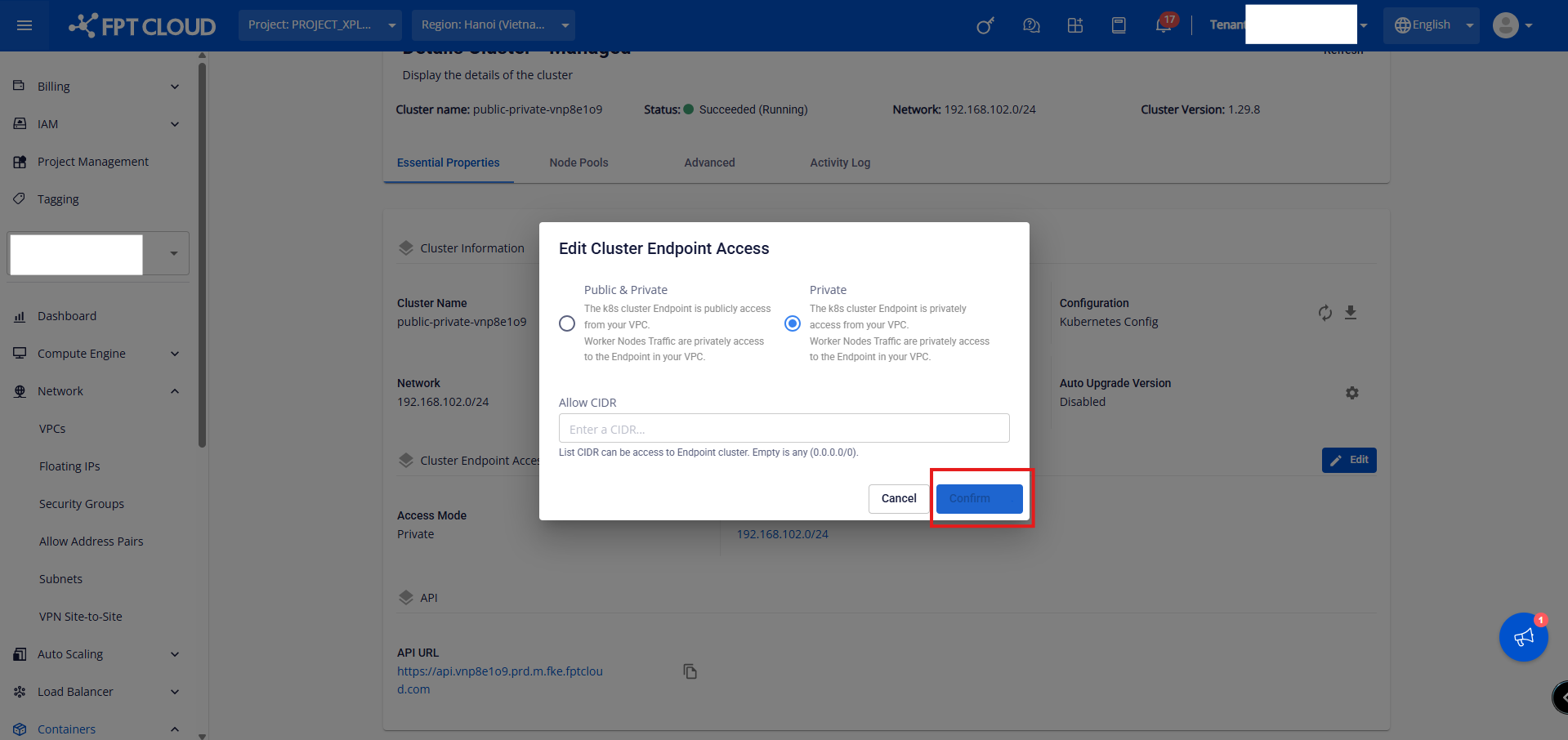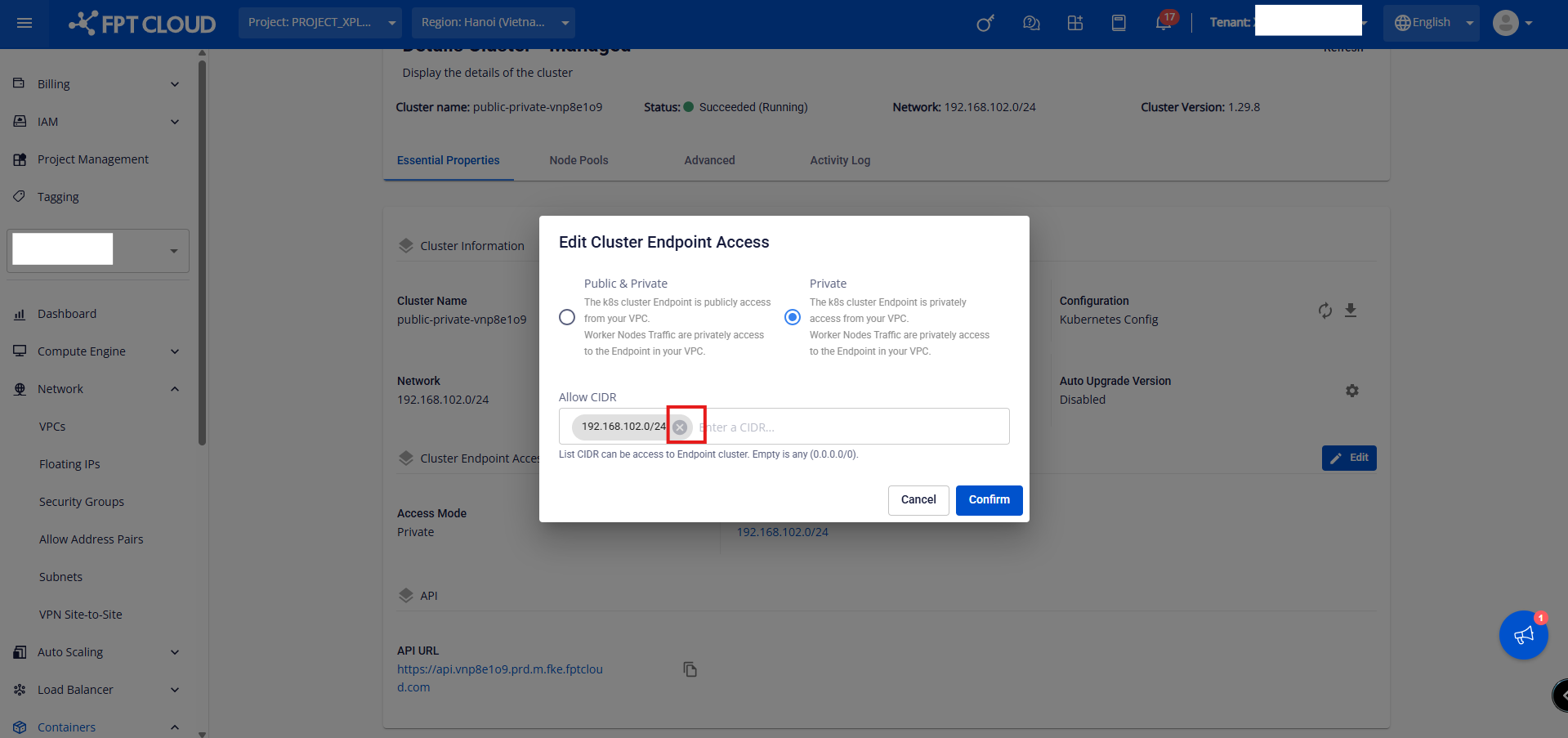 Bước 1: Chọn cluster muốn thay đổi Access Mode, click vào cluster name Bước 2: Tại mục Cluster Endpoint Access, click button Edit Bước 3: Chọn Access Mode mong muốn, nhập Allow CIDR hợp lệ và click button Confirm. Để update lại Allow CIDR, khách hàng làm theo hướng dẫn sau: Bước 1: Chọn cluster muốn thay đổi Access Mode, click vào cluster name Bước 2: Tại mục Cluster Endpoint Access, click button Edit Bước 3: Nhập thêm dải CIDR hợp lệ và click button Confirm. Để xóa bỏ Allow CIDR, khách hàng làm theo hướng dẫn sau: Bước 1: Chọn cluster muốn thay đổi Access Mode, click vào cluster name Bước 2: Tại mục Cluster Endpoint Access, click button Edit Bước 3: Xóa bỏ toàn bộ CIDR đã có và click button Confirm Quá trình update Access Mode sẽ thực hiện trong vòng vài phút, Status của Cluster sẽ chuyển sang Processing. Cluster vẫn hoạt động bình thường khi thực hiện chuyển Access Mode mới.